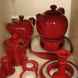 Stichwörter: Keramik, Töpferhof, Gramann, Mohnrot, Dekor 70, handgetöpfert, Tassenwärmer, Stövchen
