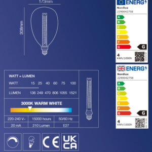 Stichwörter: E27, Hologramm, LED, G173, 3000K, 3.5W, dimmbar, 210lm, Nordlux, Gold, Deco, Drop, Big